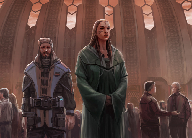 “Go on,” she breathed, downplaying the conversation so as not to attract the attention of anyone else in the chamber, a sprawling temple just as impressive for its size and grandeur as it was for the haste in which it was constructed. Despite the fact that her official title was Chief Executive Officer, she had to admit to herself that she secretly enjoyed being called Reverend Mother by the frightful, superstitious locals on many of the worlds her organization aided.